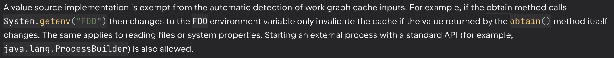 Normally, rather than Gradle automatically invalidating the cache whenever a file or environment variable changes, the cache is only invalidated when the actual value returned by the obtain() method changes. In other words, even if an environment variable changes, the cache is preserved if the return value of obtain() remains the same.