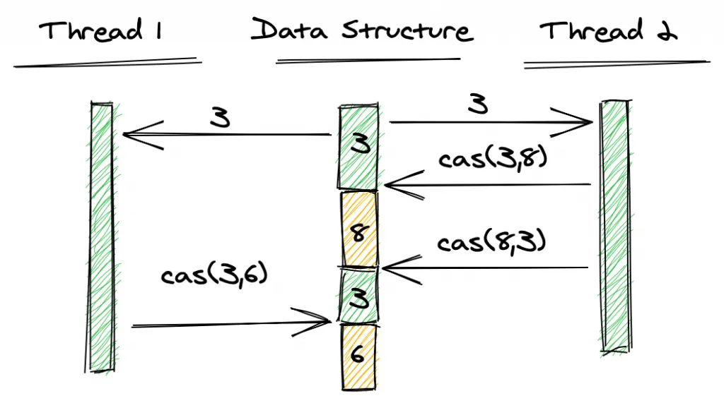 Thread 1 and Thread 2 both read the variable’s value of 3. Then Thread 2 performs a CAS and successfully sets the variable to 8. Thread 2 also performs another CAS and successfully sets the variable back to 3. Finally, Thread 1 performs a CAS expecting the value to be 3, and it succeeds despite the variable’s value having been modified twice in the meantime.