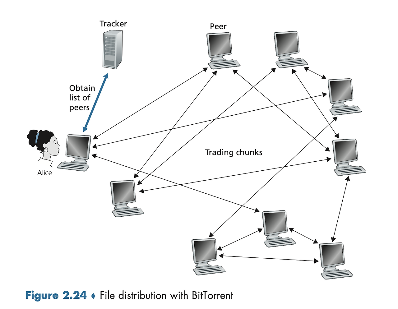 When a new peer joins a torrent, it goes through an interesting process. Suppose a peer named Alice wants to join a torrent. First, Alice registers herself with the tracker. The tracker then randomly selects 50 peers from those currently participating and sends their IP addresses to Alice. Alice uses these IP addresses to establish TCP connections with the peers, and the successfully connected peers become Alice’s “neighboring peers.” Over time, some peers leave and new ones join, causing the neighbor composition to change dynamically.