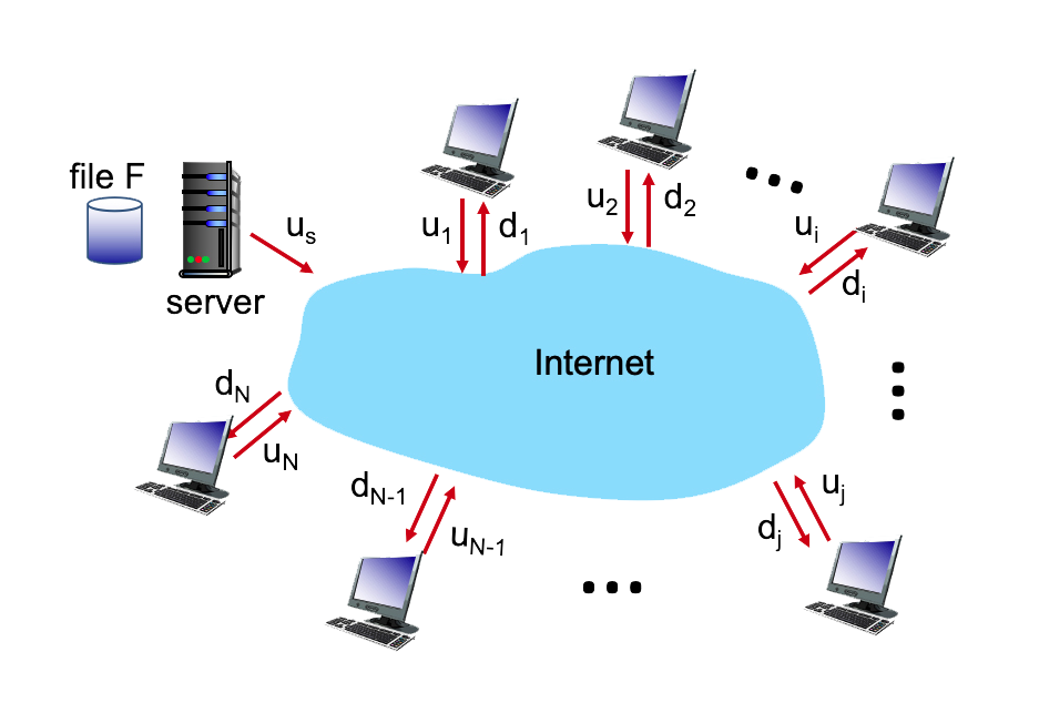 $$u_{total} = u_s + u_1 + \cdots + u_N$$Since the system must deliver $F$ bits to each of the $N$ peers, the minimum distribution time is at least: