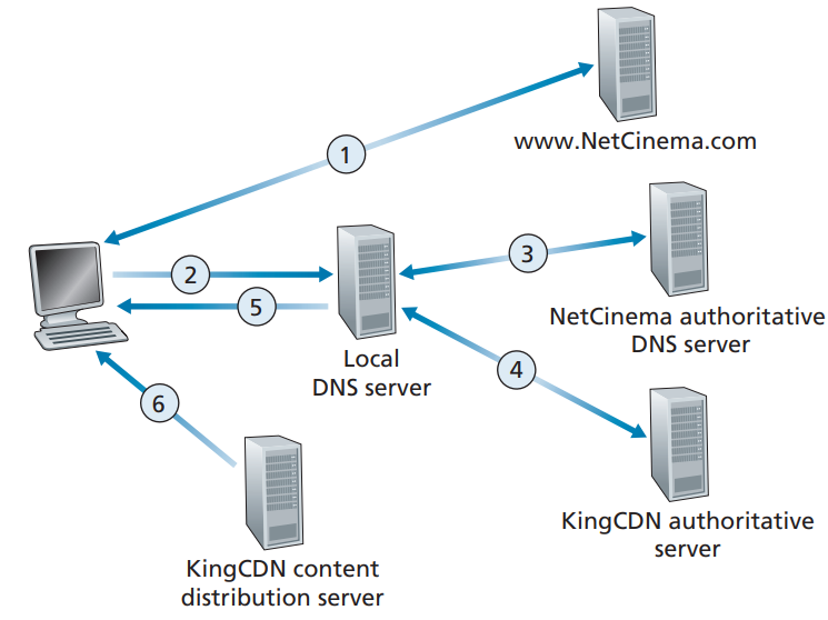 For example, suppose a content provider like Netflix uses a CDN provider like Akamai to distribute videos to customers. On the content provider’s web pages, each video is assigned a URL containing the string ‘video’ and a unique ID. If a video is assigned the URL http://video.example.com/6Y7B23V, the following six-step process occurs.